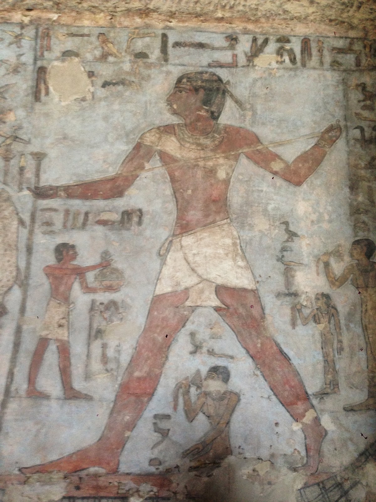 The animals in the tomb decoration below are extraordinary. On the right a man holds a basket of ducks over one arm (you can see their heads peaking out) while he holds a duck by the wings in his other hand.